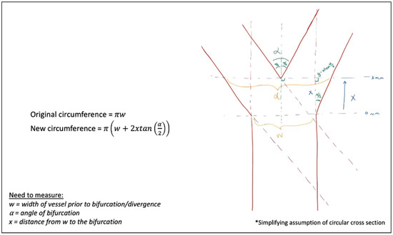 Vessel circumference at any distance, x, from the traditional vessel cross-section, w, at any bifurcation angle, α.