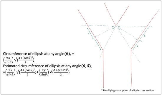 Figure 14 again broadens the previous model to any angulation, θ, to calculate the new circumference, based on the original perpendicular cross-section diameter of, a, mm, estimating based off an elliptical cross-section.