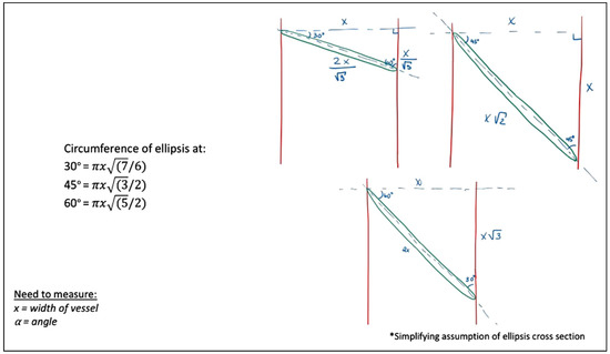 The mathematical models were theoretically developed by our team. The formulas model increases in circumference of the transection at different distances in relation to the bifurcation of a blood vessel, as well as changes in circumference at different transection angulations. To calculate circumference based on either the assumption of a circle or an ellipsis both introduced a margin of error to the formulas derived, but this margin was accepted due to the mathematical models representing elastic tissue, instead of a fixed-size material, which inherently adds a factor of estimation.