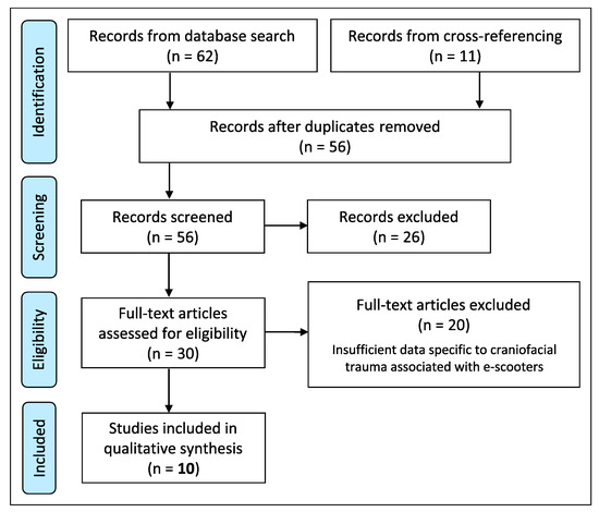 There were no non-English records. Screening by title and abstract excluded 26 irrelevant records. Assessment of 30 full-text publications resulted in the exclusion of 20 articles due to insufficient data specific to craniofacial trauma associated with e-scooters. The remaining 10 studies were deemed eligible for inclusion.