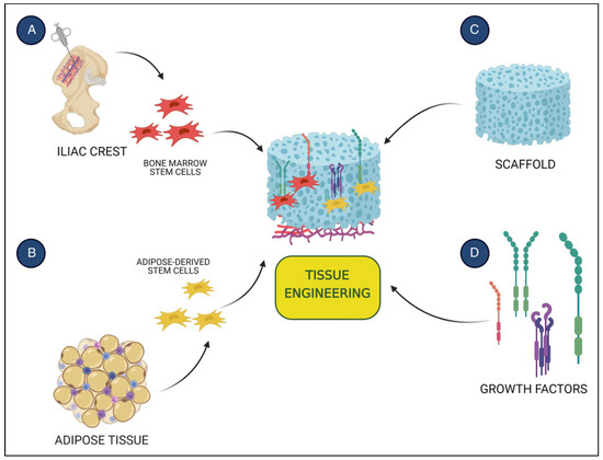 The 3 main components of the tissue engineering include: stem cells from different sources such as (A) bone marrow or (B) adipose tissue, (C) the structure that serves as support for these cells and (D) biological molecules that enhance cell’s performance. Created with BioRender.
