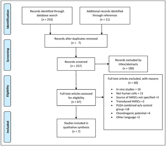 Preferred reporting items for systematic reviews and meta-analyses (PRISMA) flow diagram. Included and excluded studies. hMSC indicates human mesenchymal stem cell; PLGA, poly (lactic-co-glycolic) acid.