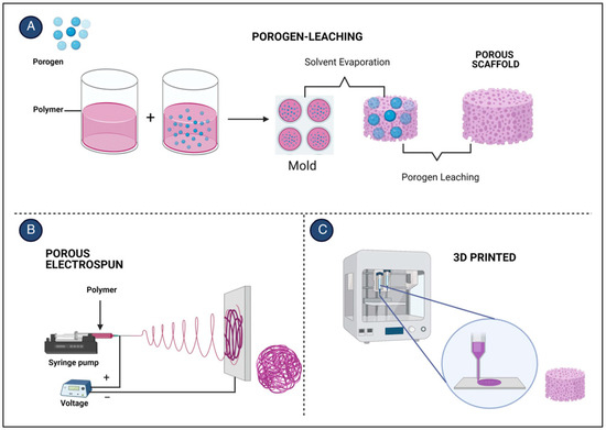 Fabrication techniques applied in the scaffold building (A) porogen leaching (B) electrospinning (C) 3-Dimensional bio-printed. Created with BioRender.