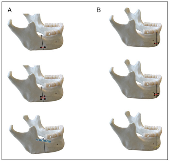 A: Fixation techniques for mandibular angle fracture. From top to bottom: single interosseous wire loop, figure-of- eight wire loop, mandibular plating. B: Fixation techniques for parasymphyseal fractures. From top to bottom: single interosseous wire loop, figure-of-eight wire loop, mandibular plating.
