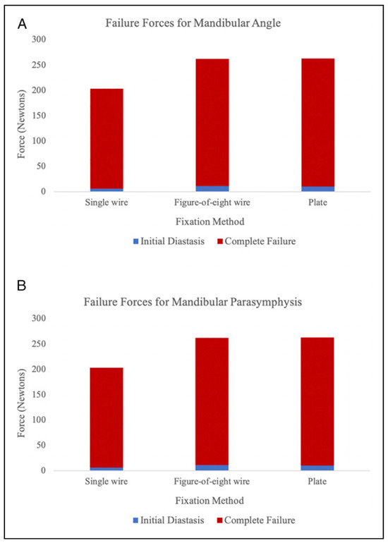 Overall results for both mandibular and parasymphyseal fractures are demonstrated graphically in Figure 2. As expected, the diastasis force was significantly lower than the failure force. Failure forces were not significantly different between the figure-of-eight wiring and plating, which approached the maximal testable forces with the described testing setup and surpassed physiologic forces.