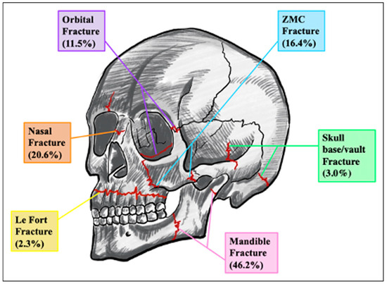 - Alqahtani, A.M. Patterns of maxillofacial fractures associated with assault injury in Khamis Mushait city and related factors. Egypt J Hosp Med. 2018, 70, 289–292. [Google Scholar]