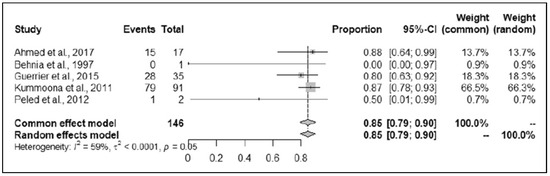 The overall proportion for the success rates of the assessed mandibular reconstruction using non-vascularised reconstructive methods was 85% (95% CI 79–90; I2 = 59%; Figure 2). This suggests that overall, the current mandibular reconstruction methods from the analysed studies are likely to be successful for 85% of the population who suffer from conflict-related mandibular trauma.
