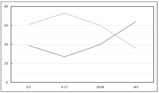 Among elderly adults, this study showed that females were more common than males. Across all other age groups, males were more common. This trend has previously been seen with other injuries, where females are more likely to sustain falls as well as maxillofacial trauma in older age groups [17,18,19]. This trend may be because there are generally a higher proportion of females than males in geriatric populations [20]. Males made up the majority of patients in all other age groups, with the highest proportion seen in 6-17 y/o. Adolescent males exhibit more risk-taking behaviors and violence than adolescent females, which may explain this result [3,21].