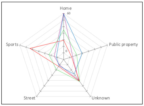Injury location was different between the age groups: 617 y/o were more frequently injured at places of sport (0-5 to 65+: 5.2% vs 43.8% vs 13.3% vs 1.8%, P < 0.001), whereas 0-5 y/o and 65 + y/o were more likely to sustain injuries at home (0-5 to 65+: 60.6% vs 19.3% vs 34.9% vs 58.9%, < 0.001) (Figure 4).The top 10 products involved in orbital injuries for each age group are reported in Table 1. Like the injury location results, a majority of the top 10 products for 6-17 y/o were sports-related, while both the 0-5 and 65+ age groups were more commonly injured by household products. The 18-64 group was injured by a mixture of products. Alcohol involvement was most frequently reported in the 18-64 age group (0-5 to 65+: 0.0% vs 0.1% vs 14.9% vs 4.0%, P < 0.001).