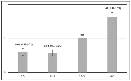 Relative risks of being admitted to the hospital. 18-64 y/o is used as the reference group. All RRs are statistically significant.