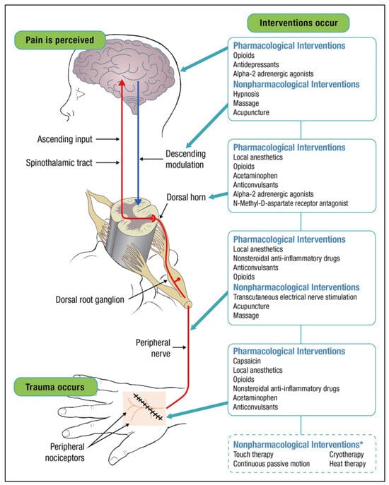 The pathway where each type of intervention exerts its mechanism of action to relieve pain (image reproduced under the terms of the Creative Commons Attribution License, and with permission from John Wiley & Sons: Multimodal pain management and the future of a personalized medicine approach to pain. AORN J. 2015;101(3):308-318. doi:10.1016/j.aorn.2014.12.009.