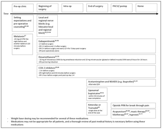 Thus far, individual pharmacologic therapeutics have been discussed. The different location of pharmacological actions can be observed in Figure 1. Using a combination of these therapies may be the best approach to optimal pain management. Multimodal analgesia, as defined by the American College of Surgeons (ACS), is the use of multiple analgesics, regional analgesia, and nonpharmacologic interventions to affect the pain pathway []. This allows for risk mitigation of individual therapies and synergistic pain control. The American Pain Society (APS) published guidelines recommending physicians utilize multimodal therapy in their practice []. Randomized trials showed analgesia combining medications with different mechanisms of action or different administrative techniques has superior pain relief and decreased opioid consumption compared to the use of a single medication [,]. While multimodal therapy is recommended, the ideal combination of treatment components will vary depending on the patient and surgical procedure. American College of Surgeon also focuses on implementing nonpharmacological management of pain such as positioning, calming, and ice []. Multimodal therapy needs to be patient centered and patient specific. Therefore, there is no perfect algorithm to follow for every patient.