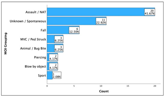 The most common etiology of injury was assault/nonaccidental trauma (NAT) at 41.7% and was equally distributed across all NSES (p = .30) (Figure 1). The second most common etiology was unknown/spontaneous (22.9%), followed by falls (12.5%), MVC/ped struck (6.25%), animal/bug bite (6.25%), piercing (4.2%), and blow by object (4.2%). There was only one sport related injury (2.1%). Only 46% of our patients had a reliable timeline from injury to accumulation given our large NAT and unknown/spontaneous populations, with the median timeframe being 0 days [range: 0–3] after initial injury. Overall, 62.5% of our patients were flagged as trauma patients.
