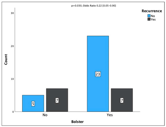 For those with interventions, median time to recurrence was 2 days [range: 0–6]. Three cases did not have a clearly documented timeframe to recurrence. Facial trauma consults resulted in lower rates of recurrence, 25.0% vs 62.5% (p = .003, OR .15 [.04-.57], Table 2). Bolster placement resulted in lower rates of recurrence, 23.3% compared to 58.3% (p = .030, OR .22 [.05-.90]), Figure 2). Individuals that were seen at one of the two level one trauma centers in the study had a lower rate of recurrence, 24.1% vs 57.9% (p = .036, OR .036 [.08-.94]). Patients that identified as black had a recurrence rate of 41.4% compared to 38.9% in patients that identified as white with no significant difference in recurrence rate (p = .866, OR .902 [.27–3.00]).