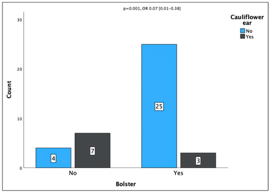 The overall incidence of cauliflower ear was 27.1%. One case was excluded due to a prior history of bilateral cauliflower ear with baseline description of the ear, and two of the cases were excluded due to lack of description of the shape of the auricle at the repeat visit. The incidence of cauliflower ears was reduced for patients at a level one trauma center, 7.1% vs 64.7% (p=<.001, OR .04 [.01–.24]), and for those with an associated injury, 13.6% vs 43.5% (p = .027 OR .21 [.05–.89]). Facial trauma consult was associated with a decreased incidence of cauliflower ear, 13.3% vs 60.0% (p = .001, OR .10 [.02–.45]). Bolster placement was associated with a reduced incidence of cauliflower ear, 10.7% vs 63.4% (p = .001, OR .07 [.01–.38], Figure 3). Material of bolster was not statistically significant (p = .052); however, use of Xeroform was associated with decreased odds of cauliflower ear (OR .18 [.07–.44]). There were no other factors associated with incidence of cauliflowers ears that were statistically significant. We did not have any instances of pressure necrosis; therefore, our cosmetic complication rate is the same population as cauliflower ears.