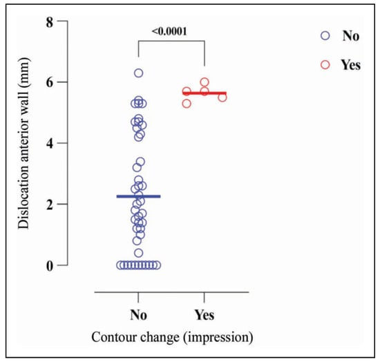 Among these five conservatively treated patients with a visible forehead impression at follow-up, the dislocation of the anterior wall fracture (measured on CT) ranged from 5.3 to 6.0 mm (p < 0.0001; Figure 1). Furthermore, five patients in the conservatively treated group without a visible forehead impression at follow-up had a fracture with dislocation >5 mm (5.3 mm for three subjects, and 5.4 mm and 6.3 mm for two subjects respectively). The correlation between dislocation on CT and subjective physician-reported forehead impression was good with a significant cut-off value of 5.3 mm, under which no forehead impression could be seen in the conservatively treated group. One subject in the conservatively treated group had a fracture dislocation >6 mm but no visible forehead impression (Figure 1).