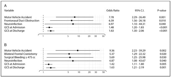Alternatively, in the regression model which included the population which underwent surgical intervention, the associated predictors of mortality, which acquired statistical significance, corresponded to Motor Vehicle Accident (p = 0.002, aOR = 9.36, 95% CI 2.23–39.29), Bilateral Frontal Craniotomy (p = 0.02, aOR = 5.37, 95% CI 1.29–22.32), Surgical Bleeding ≥ than 475 cc (p = 0.03, aOR = 5.69, 95% CI 1.25–25.98), Neuroinfection (p = 0.04, aOR = 6.87, 95% CI 1.08–43.67), GCS at Admission (p = 0.005, aOR = 1.42, 95% CI1.11–1.80), and GCS at Discharge (p = 0.001, aOR = 1.63, 95%CI 1.21–2.19). The complete information of the multivariate regression models performed is displayed in Figure 2.