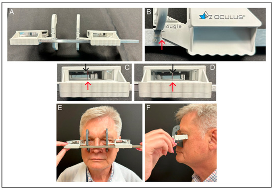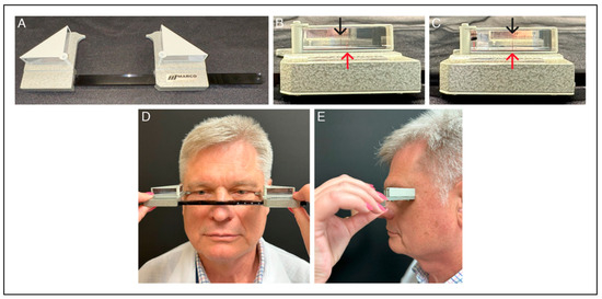 (A) Modern Hertel exophthalmometer. (B) Hertel exophthalmometer unaligned. For an accurate measurement with this device, the reading must be performed while the anterior red line is aligned with a black mark on the posterior scale. (C) Hertel exophthalmometer aligned. The red line overlaps the appropriate mark on the posterior scale, and corrected for parallax. (D) Hertel exophthalmometer. Note resting point at the lateral orbital rims. (E) Hertel exophthalmometer. Note resting point at the lateral orbital rims.