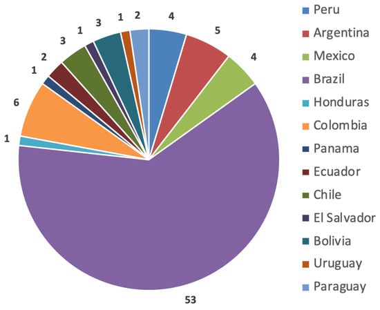 Despite LA’s extensive region with various countries, only Brazil, Chile, Argentina, and Mexico have international scientific recognition and influence []. These countries have more research development, reflected in collaborations with countries that have less research incentive. This is seen mainly in Brazil, where universities are encouraged to invest in the internationalization of their postgraduate programs, fostering both scientific and educational interaction [].