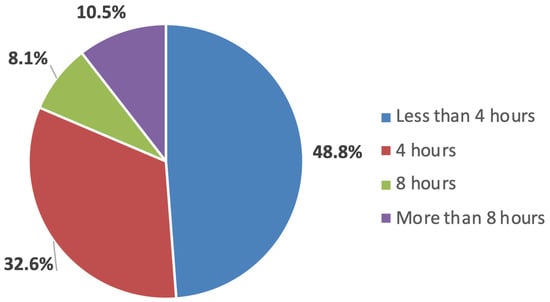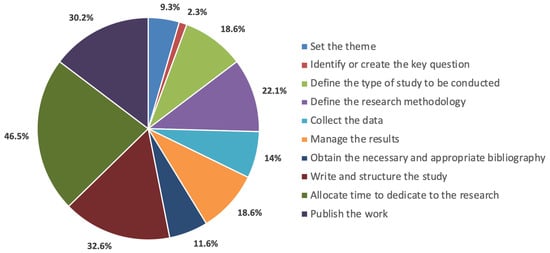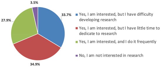 Regarding time availability for research, 48.8% reported having less than 4 h per week, 32.6% up to 4 h, 8.1% up to 8 h, and 10.5% more than 8 h (Figure 4). When asked about their number of publications (regardless of work type), 41.9% reported publishing fewer than 5 articles, 22.1% up to 10 articles, and 36% more than 10. Another question asked about their interest in taking part in a multicenter study in the region, with 95.3% responding positively. These data show participants have some experience in article development but limited dedication time.