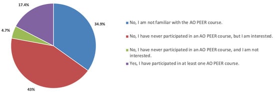 According to José-Abrego and Panduro [], strengthening medical societies and foundations prepares surgeons to face medical practice challenges. The AO Foundation has played this educational role for over six decades, combining education, research, and financial support through funding. One of the foundation’s projects is the Program for Education and Excellence in Research (AO PEER); however, 34.9% of AOCMF-LAT members are unaware of its existence. Additionally, 43% have never taken part despite knowing about it (Figure 5). Another reported data point is that 65.6% of participants are unaware of the foundation’s research grant opportunities.