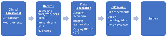 Following clinical assessment and the formulation of a treatment plan, the traditional model surgery pathway requires clinical photographs of extraoral and intraoral images, impressions to produce study models, as well as facebow and CR occlusal records to accurately mount the models on the articulator.