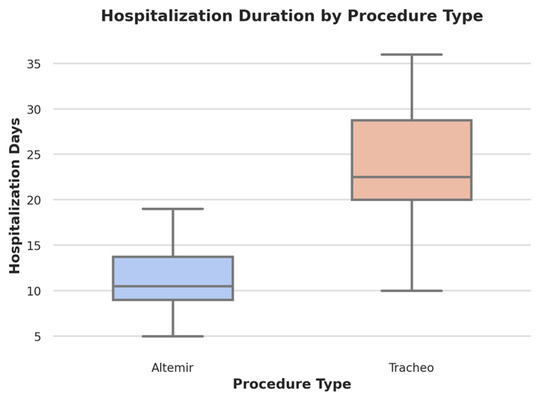 Boxplot illustrating hospitalization duration by procedure type. The Altermir technique (blue) shows a shorter hospitalization duration with a mean of 11.15 days (SD = 3.29), while tracheostomy (pink) patients experienced significantly longer hospital stays, with a mean of 23.96 days (SD = 6.47) (p < 0.001). The plot highlights the distribution, median, and variability of hospitalization days for each surgical approach.