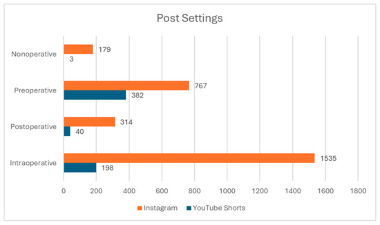 Figure 3 illustrates the distribution of social media posts based on their setting or timing, highlighting the differences between platforms, with Instagram favoring non-operative content and YouTube Shorts focusing more on post-operative content.