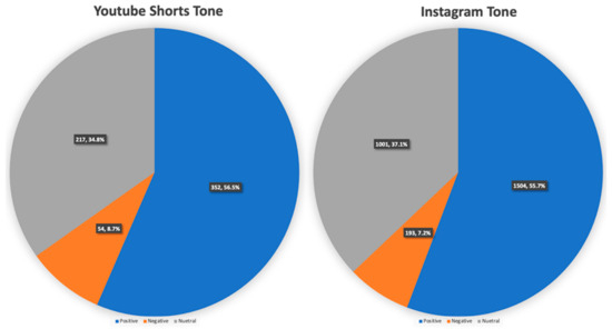 Furthermore, this study’s reliance on publicly accessible social media posts excludes insights from private accounts or users who limit their audience due to privacy concerns, a common practice among individuals. Another limitation concerns the nature of YouTube Shorts as a solely video platform; this may influence engagement in ways that Instagram may not. This difference may explain the high like average seen for YouTube Shorts relative to that for Instagram posts. Thus, we could not fully assess whether this imbalance was caused by the algorithm of the two separate platforms or by the nature of the content. Another limitation lies in the subjective nature of data collection, particularly in categorizing posts as positive, negative, or neutral, which may introduce bias and variability in interpretations. The authors showed reliability in categorizing the postings as negative, positive, or neutral. However, other researchers may differ in their interpretation of tone, as this assessment is somewhat subjective.