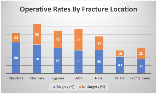 Facial fractures most impacted the maxilla (n = 127, 62%), followed by the orbit (n = 114, 56%), zygoma (n = 110, 54%), mandible (n = 104, 51%) and nasal regions (n = 95, 46%) (Figure 2). Fractures of the frontal sinus (n = 65, 32%) and palate (n = 59, 29%) were the least common. The rate of surgical repair was associated with fracture location (p < 0.001), with increased operative rates for fractures involving the mandible (80/104, 76%), palate (n = 43, 72%), nasal region (n = 60, 63%), zygoma (65/110, 59%), and maxilla (74/127, 58%). The lowest surgical repair rates involved the frontal sinus (37/65, 56%) and orbit (59/114, 51%; Figure 2). Among the mandible fractures, the technique for repair most often involved MMF (n = 30, 37%), ORIF (n = 22, 27%), a combination of ORIF and MMF (n = 9, 11%), a combination of OREF (n = 5, 6%), or a combination of OREF and ORIF (n = 13, 16%). Operative repair was more likely to be performed in patients with fractures of both the zygoma and maxilla (63/97, 65%, p < 0.05) and concomitant nasal and zygoma fractures (48/69, 70%, p < 0.05).
