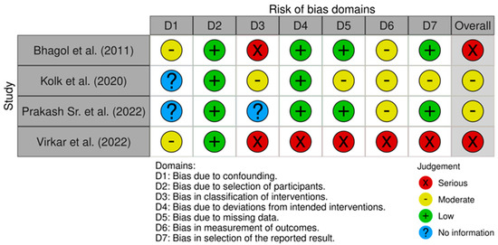 Risk of bias assessment—Robins-I tool—Bhagol et al. (2011) [18], Kolk et al. (2020) [19], Prakash Sr. et al. (2022) [20], Virkar et al. (2022) [21].