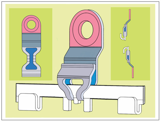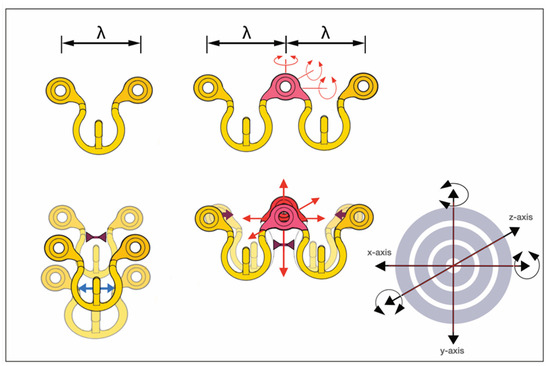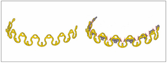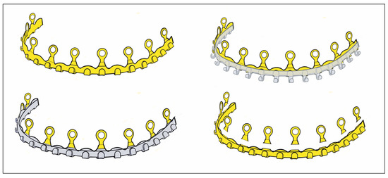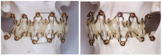 Rothe et al. (2018 [6], 2019 [7]) as well as Pathak et al. (2019) [8] offered a prefabricated modification of a conventional Erich arch bar. The number of winglets was reduced by omitting every second winglet. The enlarged spaces between the remaining winglets were available to machine screw-receiving holes enclosed by a reinforced safety ring to avoid material breakage (Figure 1 frame, C).