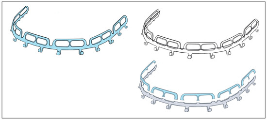 The embodiment of the OmniMax arch bars is an in-plane-bent or curved plate, respectively, that carries 12 horizontal slots rising along its length (Figure 3) to accept the bone retaining screws (OmniMax Device ID K143336, Biomet Microfixation OmniMax MMF System, US Patent No 2015/0297272 A1—22 October 2015 [35], Zimmer OmniMax Brochure—Last Internet access February 2025). These screw slots have an elongated oval shape and are organized inside six mounting tabs, each of them enclosing a pair of such slots with a supporting strut in between. Five U-shaped notches between the mounting taps interrupt the longitudinal plate profile and provide a segmental geometry of six uniform sections.