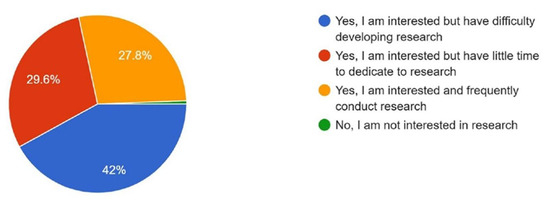 Figure 1). The survey comprised 13 structured questions designed to assess the current state of research development in the region, as well as participants’ knowledge and awareness of the topic. Regarding research interest, 42% reported being interested but had difficulty developing research. About 29.6% were interested but had little time, while 27.8% actively conducted research with a small portion expressed no interest (