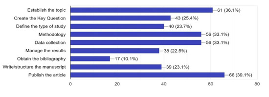 The main difficulties cited were Publishing the article (39.1%), Establishing the topic (36.1%), Methodology and Data collection (33.1%), Creating the key question (25.4%), Defining the type of study (23.7%), and Writing/structuring the manuscript (23.1%). Additionally, 22.5% had difficulty in Managing the results and 10.1% had issues Obtaining the bibliography (