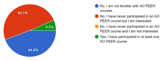 When asked about participation in AO PEER courses, 49.1% reported that they had not participated but were interested, 44.4% were not familiar with the courses, and 6.5% had participated in at least one AO PEER course (