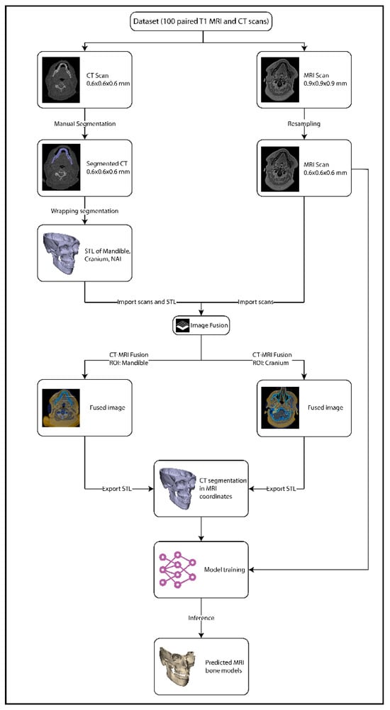 All STL files were uploaded to Brainlab software 4.5 (Brainlab, München, Germany) and linked to the corresponding CT scan. The image fusion tool was then used to align the CT scan with the T1 MRI scan. Since neither the CT or the MRI was acquired in occlusion, this process was repeated twice, to overcome the positional difference in the bones between the MRI and CT, by an experienced operator (RtB): once with the region of interest (ROI) set on the mandible during fusion, after which the mandible and NAI STL files were exported; and once with the ROI set on the cranium, after which the cranium STL file was exported. These STL files were transformed into nii.gz files to serve as a mask in training. The image processing workflow is illustrated in Figure 1.