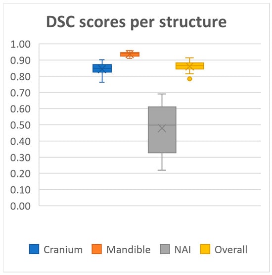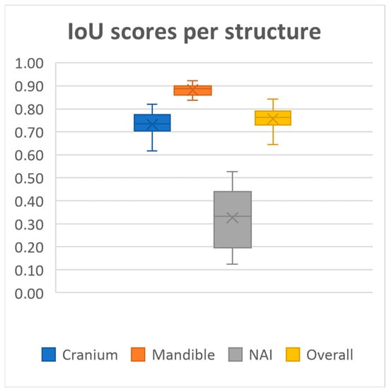 Performance was consistently high for both the mandible and cranium, with the mandible achieving the highest scores, as well as the lowest standard deviations across all metrics (Dice 0.94 ± 0.01, IoU, 0.88 ± 0.02, Precision 0.94 ± 0.01, Recall 0.93 ± 0.03, HD95 1.60 ± 0.42). The cranium segmentation performed slightly lower across all metrics, indicating a more variable segmentation performance compared to the mandible (Dice 0.84 ± 0.03, IoU, 0.73 ± 0.05, Precision 0.84 ± 0.06, Recall 0.85 ± 0.06, HD95 4.71 ± 2.07). In contrast, segmentation performance for the NAI was considerably lower than those of the bony structures, highlighting difficulty in accurately segmenting the NAI (Dice 0.48 ± 0.14, IoU, 0.33 ± 0.12, Precision 0.53 ± 0.14, Recall 0.46 ± 0.16, HD95 2.77 ± 1.28).