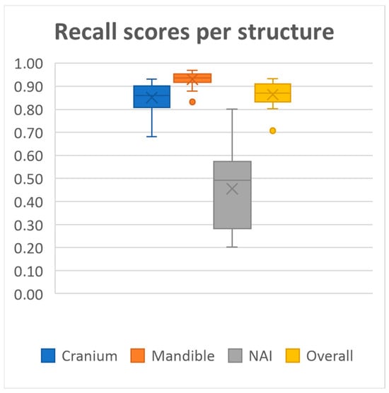 Median recall scores per structure and all structures combined.