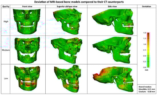 Visualisation of MRI-based bone models for a high-, medium- and low-quality result. The distance map shows deviations compared to their CT counterparts, with green representing small differences (0–0.5 mm) and red representing large differences (>1 mm). Localized larger deviations are qualitatively observed in the dorsal part of the cranium, mandibular condyles, and teeth.