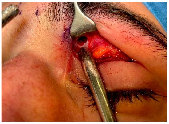 Prior to initiating the surgical procedure, several anatomical landmarks are marked. It is advisable to outline the contours of the frontal defect before reduction, as identifying the original borders may become more difficult once manipulation has begun. In addition, the expected location of the supraorbital neurovascular bundle is marked, followed by the planned incision line. An upper blepharoplasty approach is commonly employed to access the anterior portion of the superomedial orbital wall.