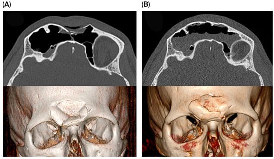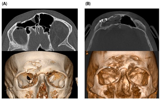 - Kim, I.; Kim, J.-M.; Kim, J.; Lee, S.J.; Nam, E.-C. Management of frontal sinus trauma: A retrospective study of surgical interventions and complications. Maxillofac. Plast. Reconstr. Surg. 2024, 46, 4. [Google Scholar] [CrossRef] [PubMed]