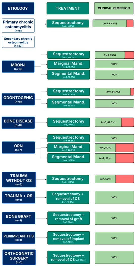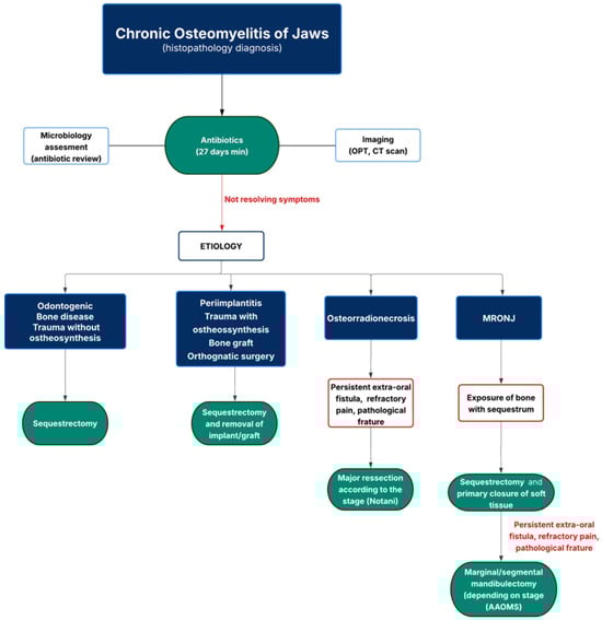 Objective: This study aims to evaluate the management and outcomes over 14 years at a tertiary maxillofacial surgery unit. Methods: Retrospective cohort study of patients from a Portuguese tertiary center of maxillofacial surgery with histopathologically confirmed diagnoses of chronic osteomyelitis of the jaws between January 2010 and December 2023. Demographic and clinical characteristics, treatment, and progression of the disease were evaluated. Results: Fifty-three patients were included—28 women (52.8%), mean age 55 (95% CI 5–90) years. The mandible was affected in 84.9% (