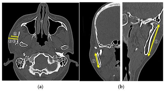 In the CT image evaluation, measurements were obtained on the fractured side for all items. The masseter muscle thickness was measured at the mandibular foramen level on the axial images (Figure 1a①). The skin-to-fracture distance line was measured at the level of the mandibular notch (mm, Figure 1a②) and the mandibular foramen (mm) on axial images (Figure 1a③). Mandibular ramus length (mm) was measured as the distance from the inferior border of the mandible to the mandibular condyle on coronal images (Figure 1b①). The distance from the inferior border of the mandible to the center of the fracture line (mm) was measured as a straight-line distance on coronal images (Figure 1b②).