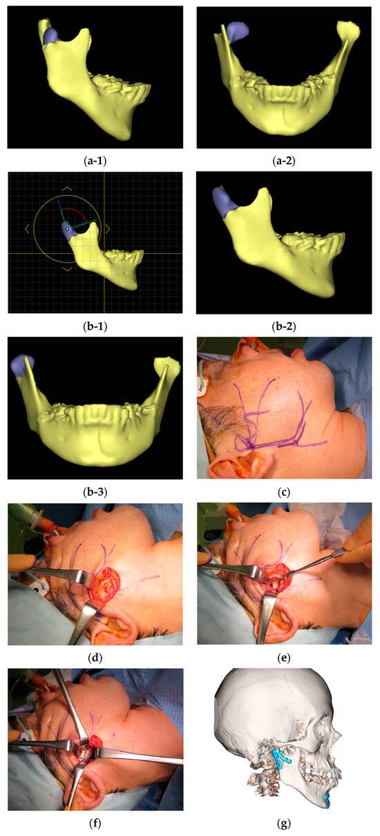 Diagnosis and treatment planning were performed using three-dimensional computer simulations. The surgeon discussed the simulation results with the supervising physician to establish a diagnosis and treatment plan (Figure 2a-1,a-2,b-1–b-3). The basic HPA surgical procedure and postoperative management included the following steps: IMF was performed using screws and a 0.5 mm wire to immobilize the maxilla and mandible in centric occlusion. A 4–5 cm incision line was made 0.5 cm below the lower border of the mandible (Figure 2c). After skin incision, the platysma muscle was adequately exposed (Figure 2d). A 1 cm incision was made parallel to the lower border of the mandible. Care was taken to avoid damage to the facial nerve; the platysma muscle was undermined, and the masseter fascia was exposed. The masseter fascia was incised by making an incision perpendicular to the masseter fibers to reach the mandibular bone surface, and the masseter muscle was peeled along with the periosteum from the mandible to expose the fracture site (especially in cases of dislocation of bone fragments, an IMF screw was placed in the distal bone fragment, which was pulled downward to create some space, and a reduction technique was used for the dislocated bone fragment; Figure 2e). Two buttresses were fixed at the mandibular notch and the posterior margin of the mandibular ramus using a titanium plate (Figure 2f,g). The IMF was subsequently removed, the absence of issues with mandibular movement was confirmed, and the wound was closed. Post-operatively, IMF was not performed, and only occlusal guidance using elastic rubbers was performed.