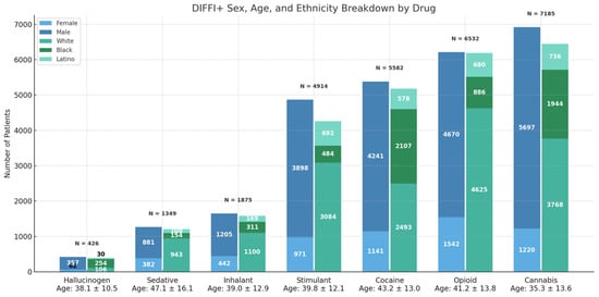 When identifying demographics of DIFFI+ amongst specific drugs, it is evident that DIFFI+Cannabis occurs most frequently (n = 7185), followed by DIFFI+Opioid (n = 6532), DIFFI+Cocaine (n = 5582), DIFFI+Stimulant (n = 4914), DIFFI+Inhalant (n = 1875), DIFFI+Sedative (n = 1349), and lastly DIFFI+Hallucinogen (n = 426). DIFFI+Sedatives have the oldest average age (47.1 ± 16.1), while DIFFI+Cannabis has the youngest average age (35.3 +/− 13.6) (Figure 1). DIFFI+Cocaine injury occurred at significantly higher rates in Black/African American populations compared to DIFFI− in the same race category (37.7% vs. 14.4%, p < 0.001). White patients comprise the greater proportion of DIFFI+Opioid (n = 4625, 70.8%), closely followed by DIFFI+Sedative (n = 943, 69.9%).