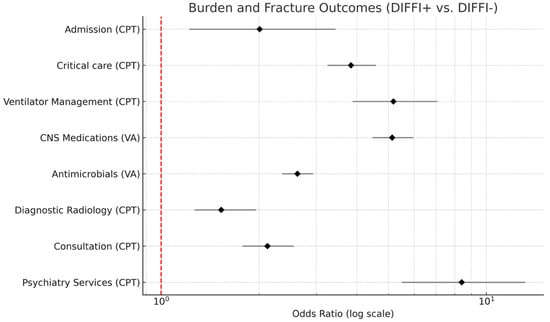 Forest plot displaying odds ratio (log scale) for hospital burden and fracture related outcomes among DIFFI+ vs. DIFFI− patients. Diamonds represent an estimated odds ratio amongst all drug groups, and horizontal lines denote a 95% confidence interval. The red dashed line indicates the null value (OR = 1).