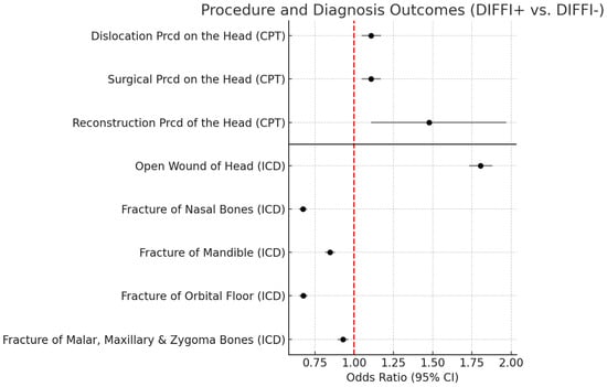 DIFFI+ experienced greater odds of fracture and/or dislocation procedures (open/closed reduction) on the head (OR = 1.11; 95% CI: 1.05–1.17), surgical procedures on the head (OR = 1.11; 95% CI: 1.05–1.17), and reconstruction procedures on the head (OR = 1.48; 95% CI: 1.11–1.97). DIFFI+ experienced a higher diagnosis of open wound of the head (OR = 1.81; 95% CI: 1.73–1.88). Alternatively, DIFFI+ experienced reduced odds of having a diagnosis outcome of fracture of nasal bones (OR = 0.67; 95% CI: 0.65–0.67), fracture of mandible (OR = 0.85; 95% CI: 0.81–0.88), fracture of orbital floor (OR = 0.68; 95% CI: 0.65–0.70), or fracture of malar, maxillary and zygoma bones (OR = 0.93; 95% CI: 0.90–0.96) (Figure 3). All values in the forest plot (Figure 3) greater than 1 (red dashed line) represent the increased odds outcomes in the DIFFI+ group. Values less than 1 represent decreased odds outcomes in the DIFFI+ group.