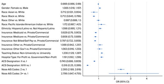 Figure 1 displays odds ratios and confidence intervals between social determinants of health and closed nasal bone reduction. An odds ratio greater than 1 indicates increased odds of having closed reduction, while an odds ratio less than 1 indicates decreased odds of having closed reduction. For categorical factors, odds ratios are compared to the reference group.