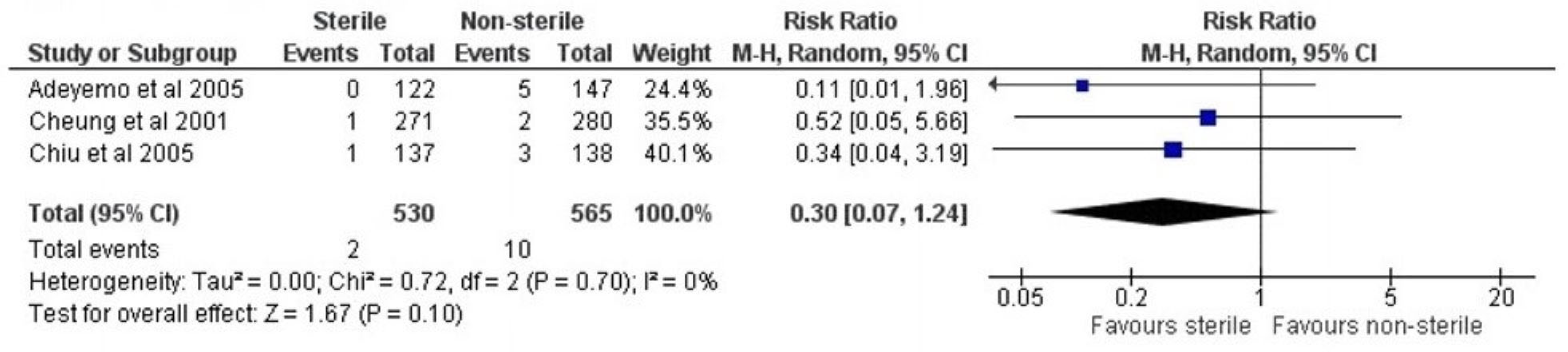 | Chiu et al. (2005) [23] | RCT | Surgical & non-surgical | 137 | 138 | 7 days | 1 (0.7) | 3 (2.2) | 0.336 (0.035–3.188) |
